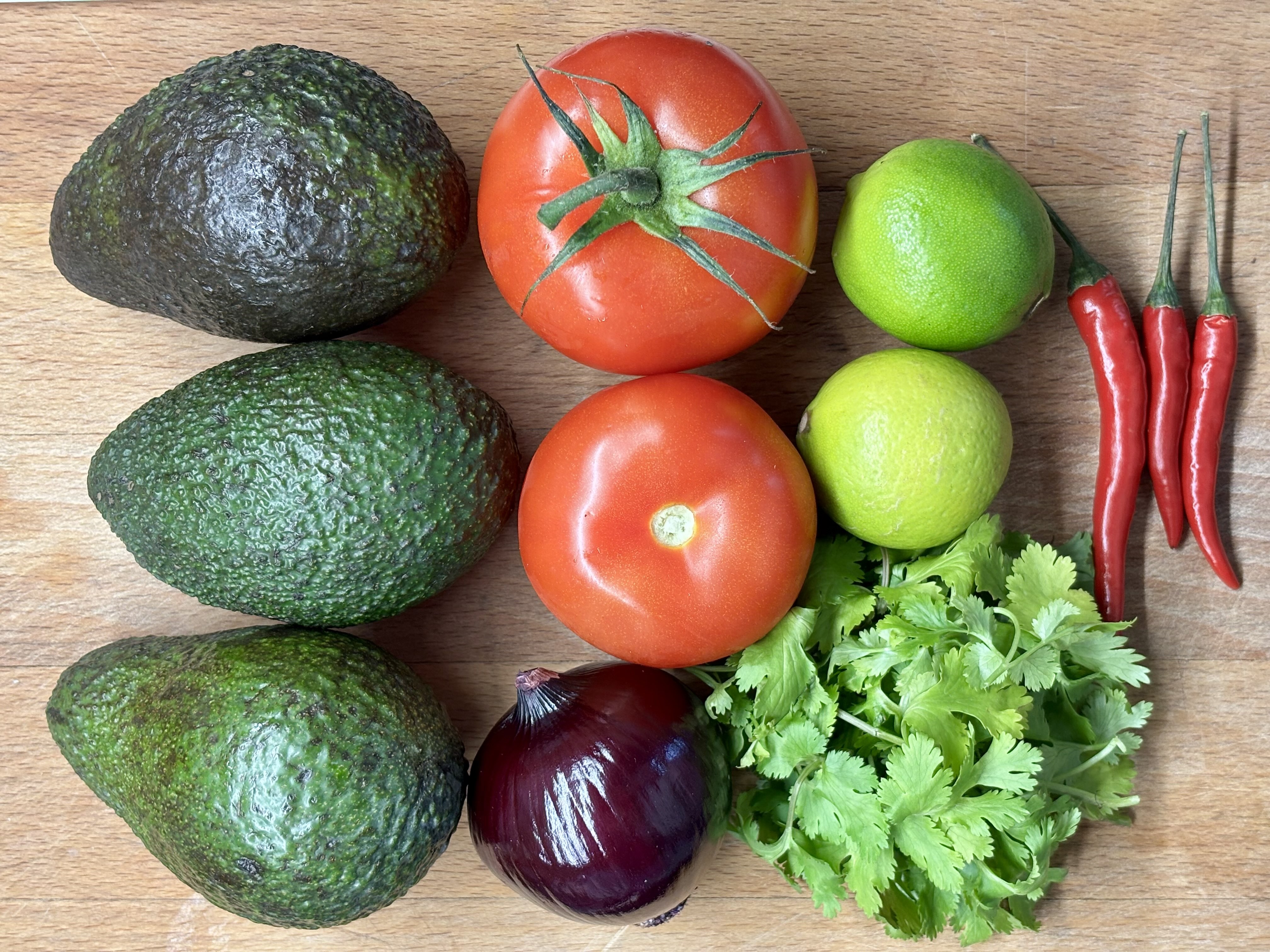 авокадо, помидоры, красный репчатый лук, лайм, кинза, красный острый перец, соль